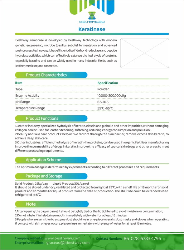 बेस्टवे केराटिनैस को बेस्टवे टेक्नोलॉजी द्वारा आधुनिक जेनेटिक इंजीनियरिंग के साथ विकसित किया गया है।बैसिलस सब्टिलिस) किण्वन और उन्नत पोस्ट-प्रोसेस तकनीक है। इसमें कुशल डिसल्फाइड बॉन्ड रिडक्टेस और पेप्टाइड हाइड्रोलाज़ गतिविधियां हैं जो प्रोटीन के हाइड्रोलिसिस को प्रभावी ढंग से उत्प्रेरित कर सकती हैं,विशेष रूप से केराटिन, और व्यापक रूप से कई औद्योगिक क्षेत्रों में इस्तेमाल किया जा सकता है, जैसे चमड़ा, चिकित्सा और सौंदर्य प्रसाधन।